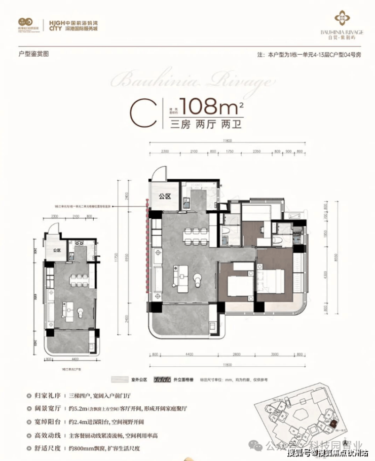 户型对比前一期紫荆府的差异就是没有追求一梯一户的布局,电梯厅采用传统布局,但是保留了每户入户前的独立公共空间。这样的好处就是增加了得房率又兼顾了私密性。
