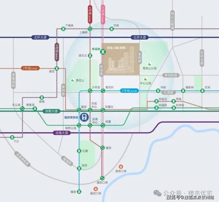 无缝接驳地铁10号线冬瓜岭站,纵享福田“一中枢、双口岸、四核心”枢纽体系,再造引桥匝道升级微循交通体系,高效互联湾区城市与全球资本。