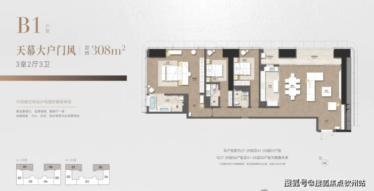 位于27-39层,每层2套对称分布,整个T2栋26套。比308㎡多一个房间和一个艺术品展示区,四个房间有三个都是套房设计,另外一个雪茄房,也能改造成书房、会客厅等。