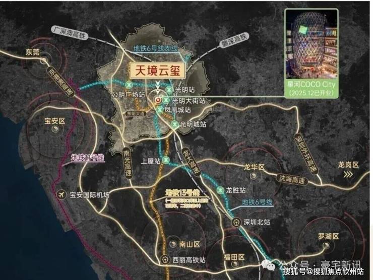 •通过光明城站,可便捷换乘莞惠深城际、赣深高铁、广深港高铁等数据来源:深圳光明公众号,8站直达南山,指地铁6号线光明大街站,3站至地铁13号线上屋站,再经5站至地铁13号线留仙洞站(南山区),2025年12月28日,地铁13号线一期(深圳湾口岸至上屋站)已通车,二期在建中。二期开通后,从光明到南山换乘更加便捷。最终以政府公布交通规划为准。