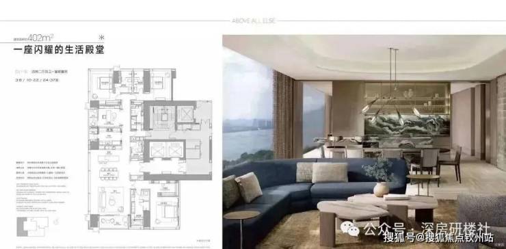 4栋51至63层3.6-3.9米层高公寓(含388米主塔楼T1,为深超总标志性工程)、2栋高层办公楼、19套独栋董事公馆、16套合院别墅,以及约1.4万㎡高端定制商业;