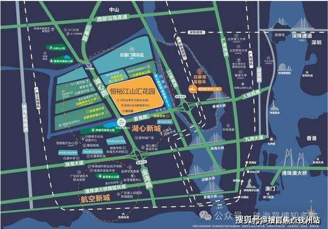 珠海西拓首站、湖心新城要塞枢纽,紧邻香海桥湖心路出口,目前已全线通车,从项目出发,20分钟通达主城区,毗邻鹤州珠海中心站CBD,距离项目约5公里珠海中心站(鹤洲)。