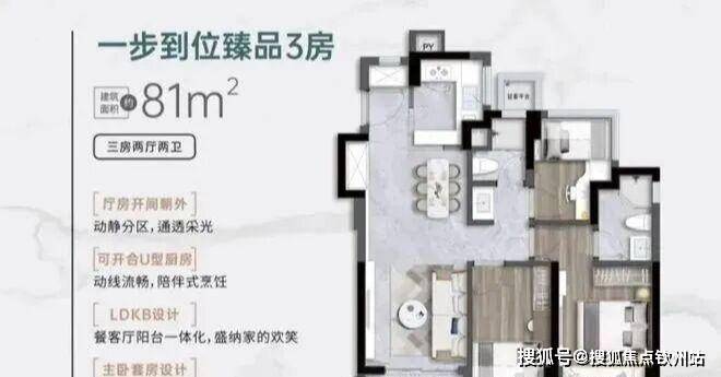 设计的是竖厅格局,客厅3.05米开间,LDKB一体化,S墙预留冰箱卡槽位,动静分区,U型厨房,卫生间三段式干湿分离还带1个设备平台,得房率约91%(包含赠送),实用面积约73.71㎡,正东或正南朝向。