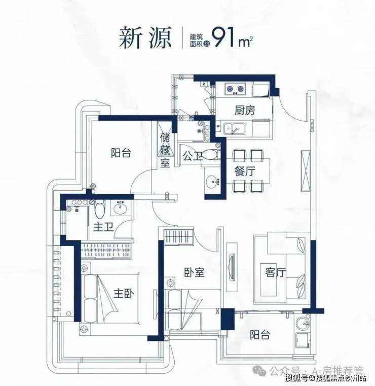 91㎡的3房2厅2卫,设计的是经典竖厅格局,进门入户玄关,客厅3.3米开间,LDKB一体化设计,动静分区,三开间朝南,主卧转角飘窗带1个设备平台,U型厨房,公卫三段式干湿分离,还带1个设备平台,得房率约89%(包含赠送),正南朝向。