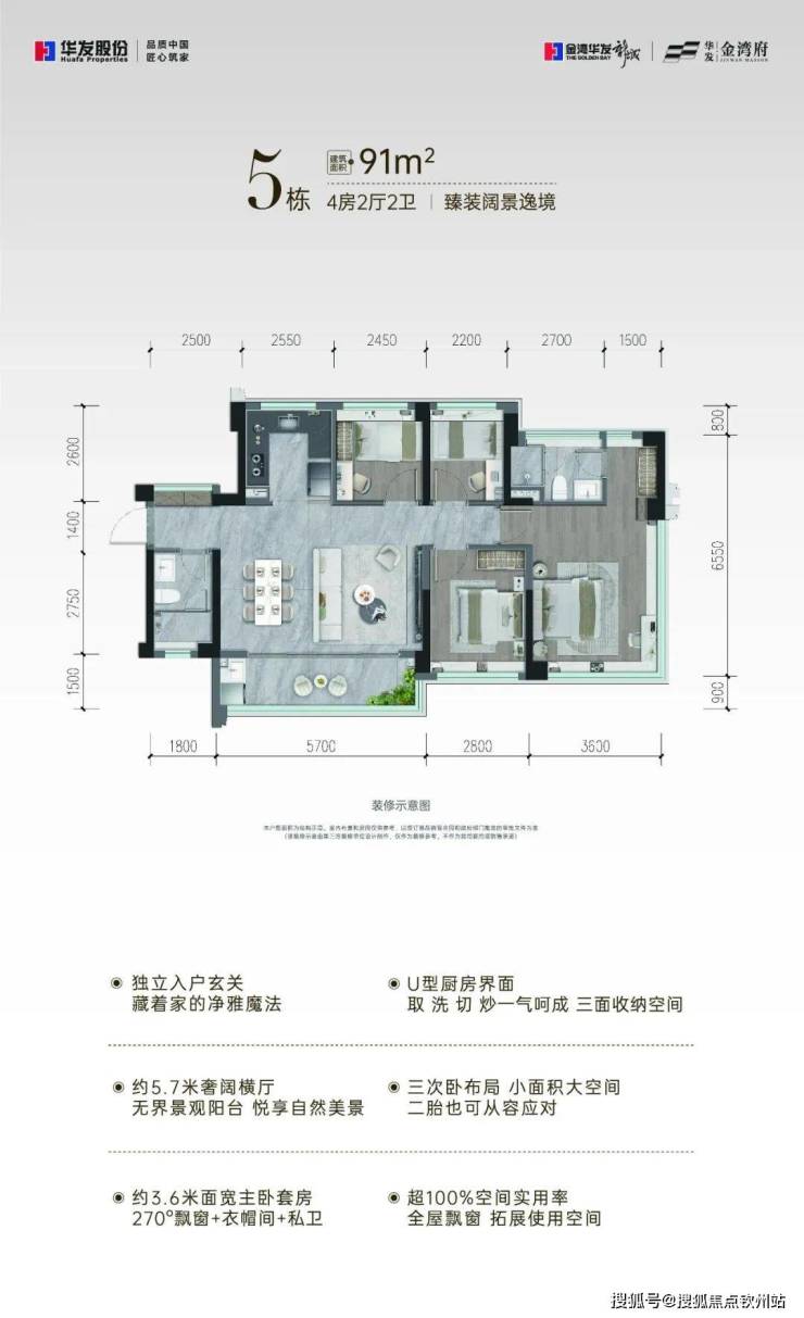 在常规开发商手里,约90㎡只能压缩出三房,而金湾府的「空间折叠术」让91㎡生长出约5.7米的无界大横厅、四间全功能卧室,以及全屋飘窗。