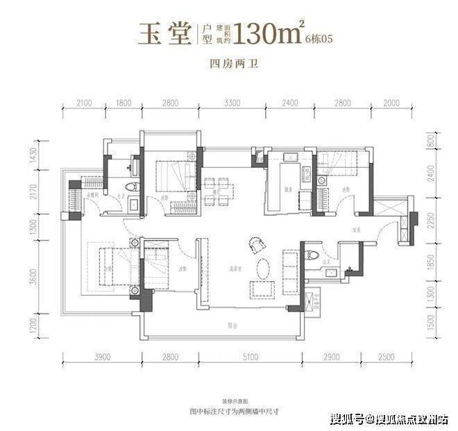 130㎡的4房2厅2卫,设计:南北通透,独立玄关,客厅5.1米宽。客餐厅分离,主卧270°飘窗+衣帽间,面积分别为23.66㎡、11.2㎡、8.96㎡、7.84㎡(含墙体飘窗)。U型厨房外置烟道,卫生间干湿分区,得房率101.95%(含赠送)。客厅连次卧大阳台14.09平,东北向。