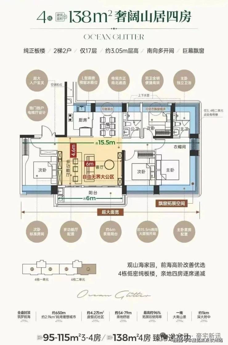 这次推出的138㎡为小区楼王3/4栋,17层2梯2户板楼,带独立电梯厅,可以做5房,赠送后得房率去到94-97%,预计单价10万/㎡左右,总价1300万左右。