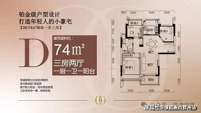约64㎡、约74㎡户型,为三房两厅一卫,能够满足三代同堂需求。
