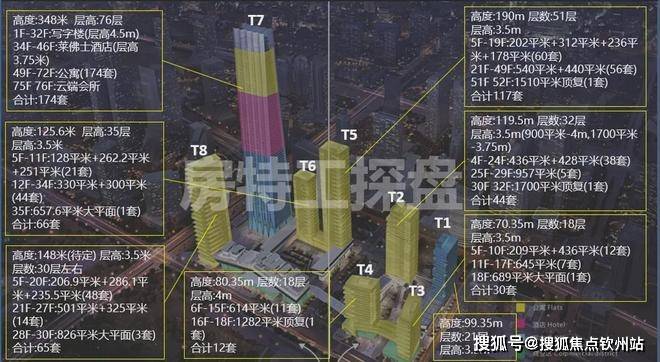 北区T1是写字楼,T2、T3、T4为公寓,南区T5、T6、T8为公寓,T7为环球商务中心;总建筑面积47.5万㎡。