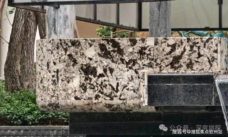 茶室底座,用的是巴西进口的雪山银狐奢石。这类奢石,因为独特的透光性,一般用于顶豪室内装饰,如今却被保利大胆用在园林公区,奢华程度可见一斑。