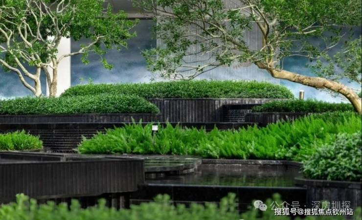水流从入口叠水瀑布倾泻而下,奔向中央镜面水池,再沿着步道溪流蜿蜒流至全园各处,业主们沿着步道漫步,能依次体验 “听水的舒缓、观水的灵动、亲水的惬意”,这是传统平面园林没有的感受。