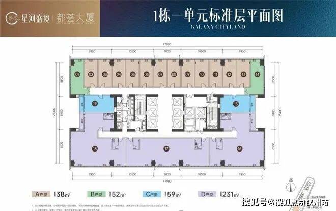 写字楼户型:38-52-59-231-1360㎡自由组合,76-152-200-300-整层1360㎡;