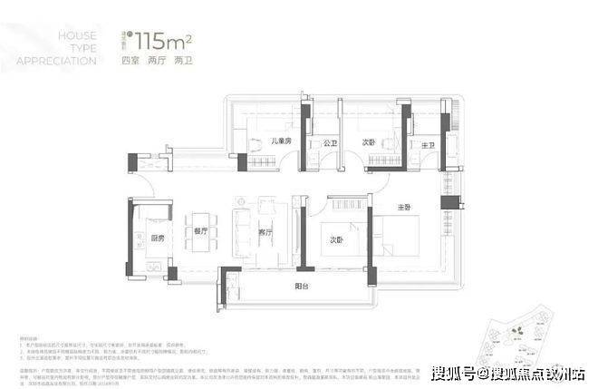 竖庭格局,西南向,基本居住功能与建面约108-110㎡4房2卫一致,但格局不一样,从目前公布的户型图上看,主要是主卧空间有了更大的提升,比如可以放更大一点的衣柜。