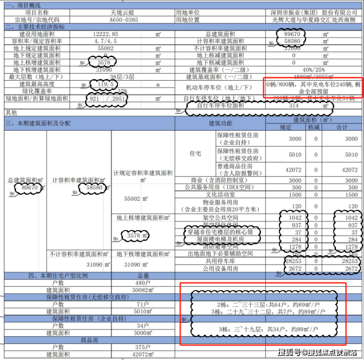 总规划480户,其中商品房375套,公租房71套,企业自持租赁住房34套,1/3栋是3梯5户设计,2栋2梯5户设计,地下3层,规划停车位800个,车位占比1:1.66。
