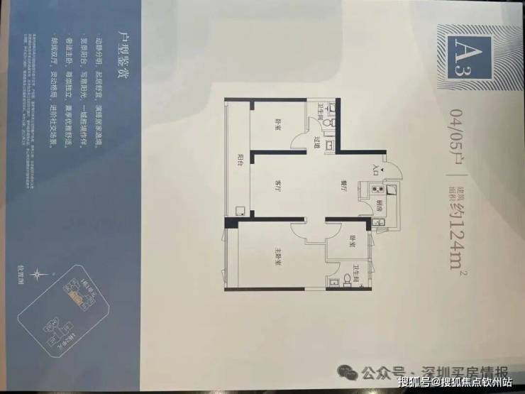 【124㎡的3+1房2厅2卫】 1栋户型,竖厅格局,LDKB一体化设计,动静分区,主卧套间设计,还有一个多功能间可以做书房,U型厨房,公卫三段式分离,得房率:72.07%(不含赠送) ;