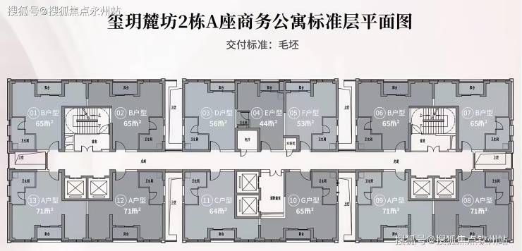 目前在售的商务公寓户型包括44㎡的1房、53-56㎡的1房以及63-65㎡和71㎡的2房2厅1卫。