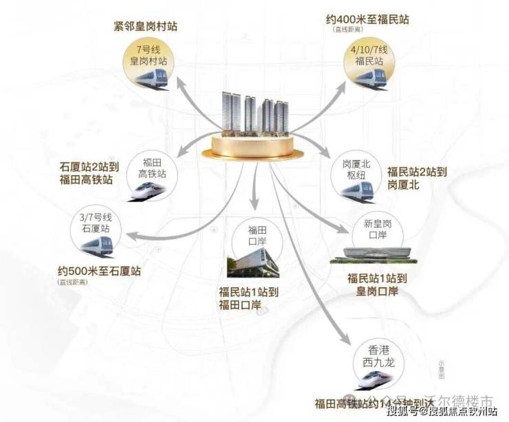 邻近皇岗村站和福民站,周边四线交汇,2站速达福田高铁站,3站直通岗厦北枢纽,待2026年新皇岗口岸落成后,轻松构建深港黄金中轴生活圈。
