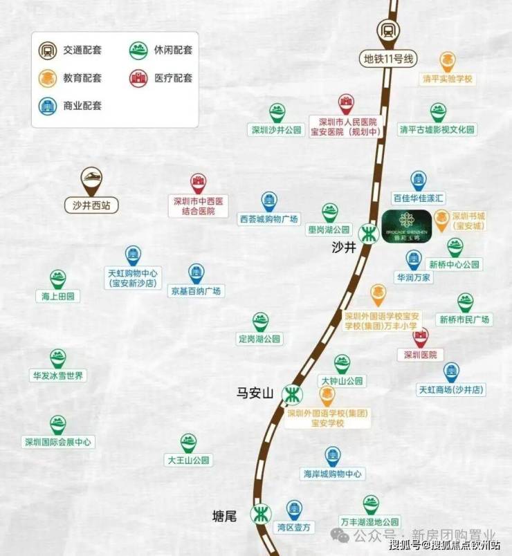 交通方面:距地铁 11 号线沙井站仅约 400 米,步行 7 分钟可达,2 站达机场东、8 站至宝中、15 站至南山高新园,通勤高效;周边广深高速、外环高速环绕,穗莞深城际沙井西站近邻,规划 18、20 号线加持,畅享大湾区 1 小时生活圈。