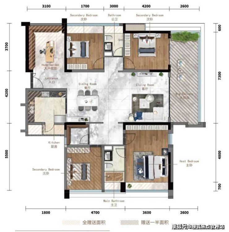 项目二期8栋02户型144㎡央景楼座户型,可瞰五桂山以及东区市区景观,还能看到星河CoCo City商超。在空间布局上,144㎡户型拥有专属入户花园,面积全赠送。