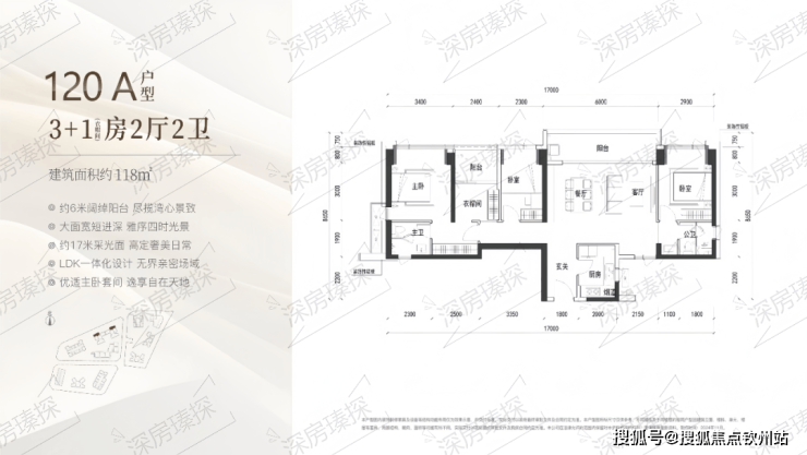 118㎡的4房2厅2卫,A户型(1栋1/2单元01户型),设计的是横厅格局,进门入户玄关,客餐厅6米开间,LDKB一体化设计,4个卧室分别做到了主卧17.65㎡/次卧11.02㎡/次卧9.12㎡/次卧8.74㎡(包含墙体飘窗),客餐厅出6米长的观景大阳台看深大校区,U型厨房,公卫三段式分离,得房率约90%(包含赠送),西北朝向。