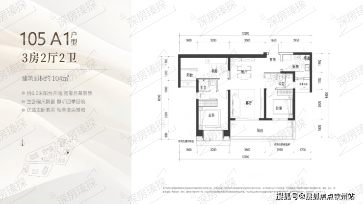 104㎡的3房2厅2卫,A1户型(2栋3单元03户型),设计的是竖厅类双龙抱珠格局,客厅3.6米开间,客餐厅一体化设计,3个卧室分别做到了主卧12.8㎡/次卧12㎡/次卧8.7㎡(包含墙体飘窗),客厅连接次卧出6.5米长的宽景大阳台,U型厨房,公卫三段式分离,得房率约90%(包含赠送),东南朝向。