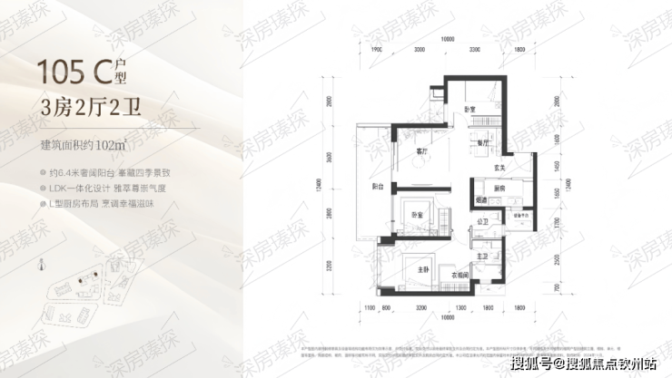 102㎡的3房2厅2卫,C户型(1栋1/2单元02户型),设计的是竖厅格局,客厅3.6米开间,LDK一体化设计,3个卧室分别做到了主卧16.93㎡/次卧9.24㎡/次卧8.96㎡(包含墙体飘窗),客厅连接次卧出6.4米长的宽景大阳台,U型厨房,卫生间干湿分离,得房率约90%(包含赠送),西南或东北朝向。