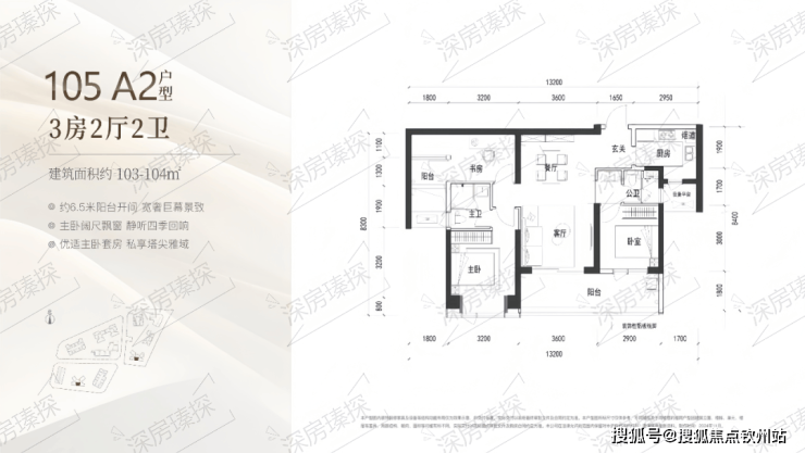 103-104㎡的3房2厅2卫,A2户型(2栋4单元/3栋2单元03户型),设计的是竖厅类双龙抱珠格局,客厅3.6米开间,客餐厅一体化设计,3个卧室分别做到了主卧12.8㎡/次卧12㎡/次卧8.7㎡(包含墙体飘窗),客厅连接次卧出6.5米长的宽景大阳台,U型厨房,公卫三段式分离,得房率约90%(包含赠送),正南朝向。跟A1户型除了朝向不一样,其它都是一致的。