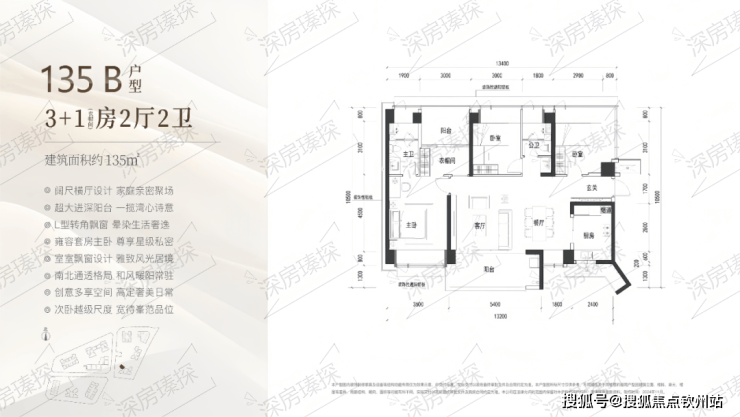 134㎡的4房2厅2卫,A户型(1栋1/2单元05户型),设计的是竖厅南北通透格局,进门入户玄关,客厅4.2米开间,LDKB一体化设计,四开间朝南,4个卧室分别做到了主卧19.44㎡/次卧10.64㎡/次卧10.26㎡/次卧7.8㎡(包含墙体飘窗),客厅连接次卧出6.8米长的观景大阳台看深大校区,U型厨房,卫生间干湿分离,得房率约90%(包含赠送),西北朝向。