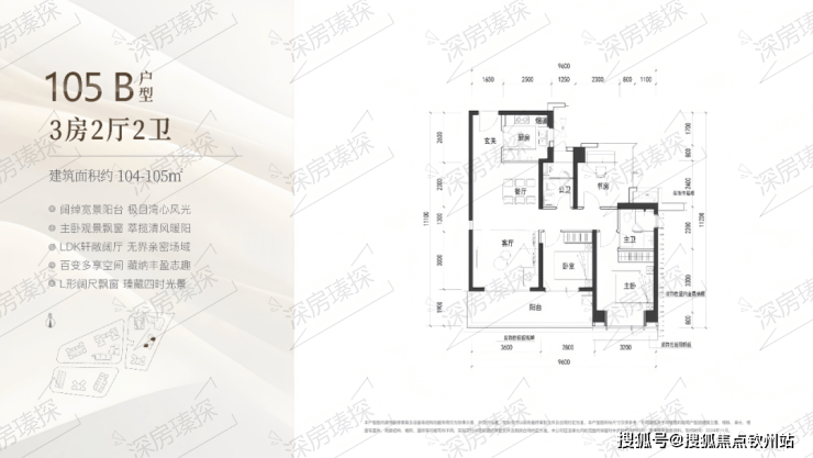 105㎡的3房2厅2卫,B户型(2栋3单元02/06户型),设计的是经典竖厅格局,客厅3.6米开间,LDKB一体化设计,三开间朝南,动静分区,3个卧室分别做到了主卧13.12㎡/次卧9.9㎡/次卧8.4㎡(包含墙体飘窗),客厅连接次卧出6.4米长的宽景大阳台,U型厨房,卫生间干湿分离,得房率约90%(包含赠送),正南或东南朝向。