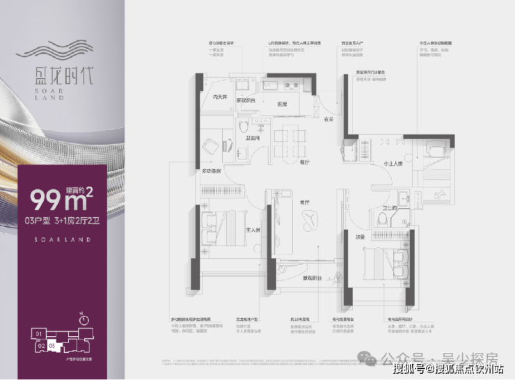 99㎡的3+1房2厅2卫,1栋C座03户型,设计的是竖厅双龙抱珠格局,客厅3.5米开间,进门入户玄关,LDKB一体化,三开间朝南,有1个多功能房间可以改多1个卧室,L型厨房带1个生活阳台,卫生间干湿分离,得房率:约76.11%(不含赠送),阳台西南朝向。