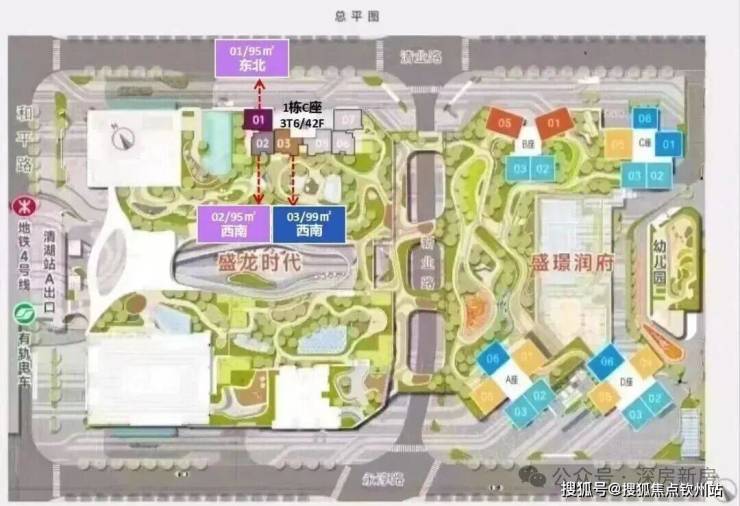 盛璟润府,总占地面积约1.79万㎡,总建筑面积约13万㎡,计容建筑面积约10.2万㎡,容积率4.85,绿化率25%,共由4栋总高45F的住宅组成,分别是2栋A/B/C/D座,还规划有1所幼儿园。