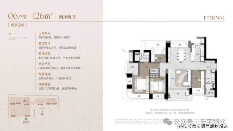 173m²的4房2厅3卫+家政间,竖厅类双龙抱珠格局,独立电梯厅入户约8.13㎡,客厅5.55米开间,LDKB一体化设计,主卧套房270°环幕凸窗+私享阳台,八大凸窗+设备平台+家政间,U型厨房,公卫三段式干湿分离。阳台正北朝向看会展中心+市民广场,得房率76%(不含赠送,套内面积131.98㎡)。