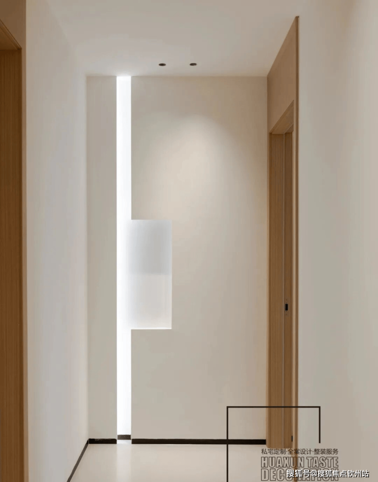 走廊尽头的一处线性光与磨砂玻璃的造型设计,成为了贯穿空间的视觉导引,让过道也变成了一处可品味的景致。