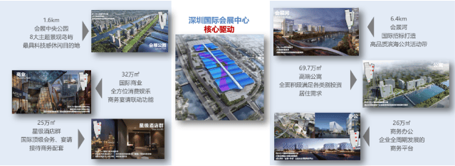 约160万㎡深圳会展中心,约154万㎡会展综合配套,形成包含城市地标、产业总部、商业中心、国际酒店群、产业展馆、精品公寓、生态公园、交通枢纽等复合功能物业群,构建集全球信息交流和消费体验于一体的会展商务平台。