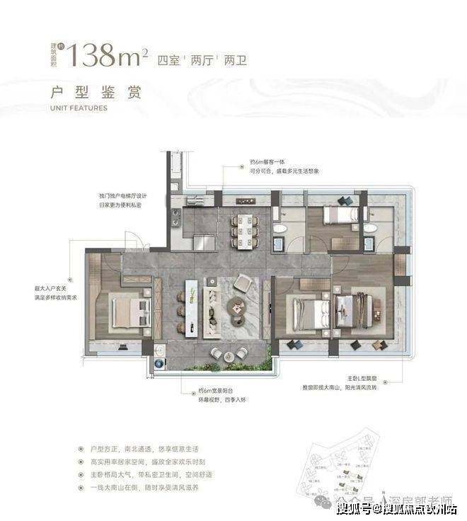 竖厅双龙抱珠,客厅3.5米开间,4个卧室分别做到了3.7米/3.4米/2.8米/2.6米,主卧、2个次卧270°全景飘窗,客厅连接次卧出6.1米长的大阳台,U型厨房,得房率约95-97%(包含赠送),西南或东南朝向。