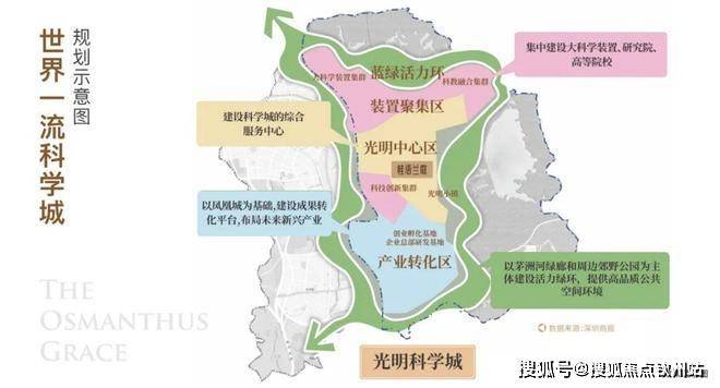 光明布局规划“一心两区”,“一心”即光明中心区,建设科学城的生活服务中心,集聚商业、居住、大型公共服务设施等顶级配套。