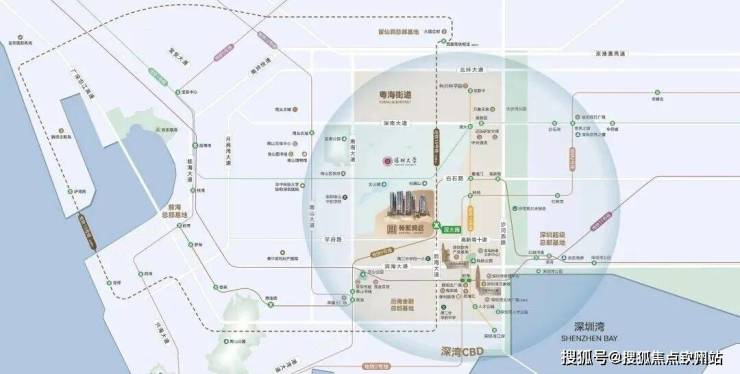 道路交通——四横三纵立体路网,四横有滨海大道、深南大道、北环大道、学府路;三纵有南海大道、后海大道、白石路出行,多主干道快速分流,畅达全城。项目直线距离蛇口码头约6.7公里,直线距离宝安国际机场也仅约15公里。