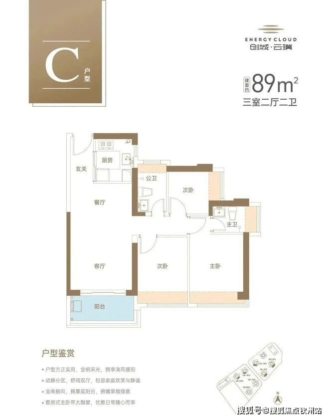 89㎡3房2卫:经典竖厅格局,进门入户玄关,客厅3.5米开间,LDKB一体化设计,三开间朝南,动静分区,3个卧室分别做到了主卧11.23㎡/次卧9.1㎡/次卧5.64㎡(实测面积,去掉墙体),U型厨房,卫生间干湿分离,得房率约73.29-73.86%(不含赠送),西南或东南朝向