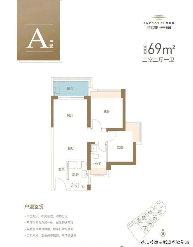 69㎡2房1卫:竖厅格局,客厅3.3米开间,LDKB一体化设计,2个卧室分别做到了主卧9.76㎡、次卧7.77㎡(实测面积,去掉墙体),U型厨房,卫生间干湿分离,得房率约73.29-73.86%(不含赠送),西北朝向