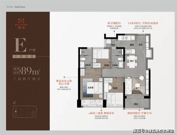 89㎡的3房2厅2卫,A户型(1栋1单元06户型),设计的是经典竖厅格局,进门入户玄关,LDKB一体化,S墙设计预留冰箱卡槽位,三开间朝南,动静分区,主卧双面大飘窗,客厅连接次卧出5.6米长的观景阳台,U型厨房,公卫三段式分离,东南朝向。