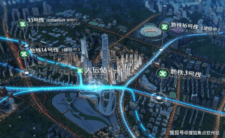 大运枢纽站标杆大盘,四轨交汇,地铁3号线和14号线、16号线和33号线(建设中),大运站将成为深圳东部大型交通枢纽,毗邻水官高速、机荷高速、惠盐高速等高速路网,多维交通网络,以速度激活全域,高效畅达湾区。