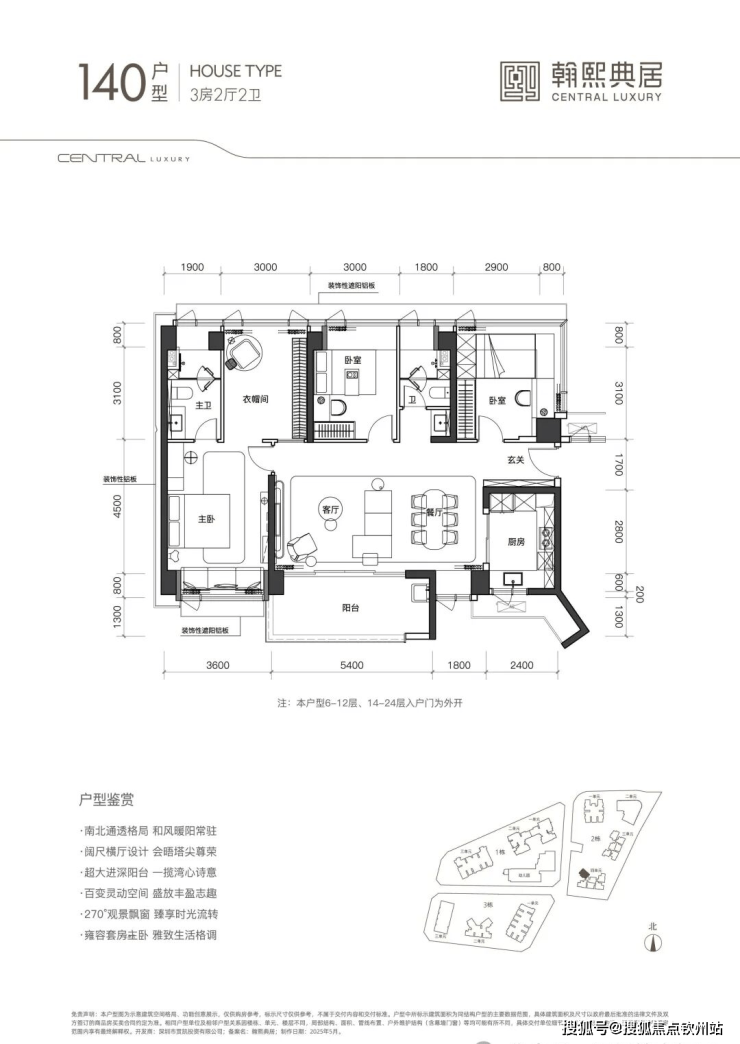 主卧:南北通风采光佳+奢享级衣帽间+带飘窗主卫、近40㎡奢阔主卧空间