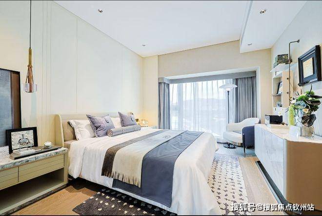 主卧空间尺度奢阔,南北通透,具有超宽开间3.7m,同时设计了全落地YKK系统门窗的凸窗,每日起床均可享有自然阳光。