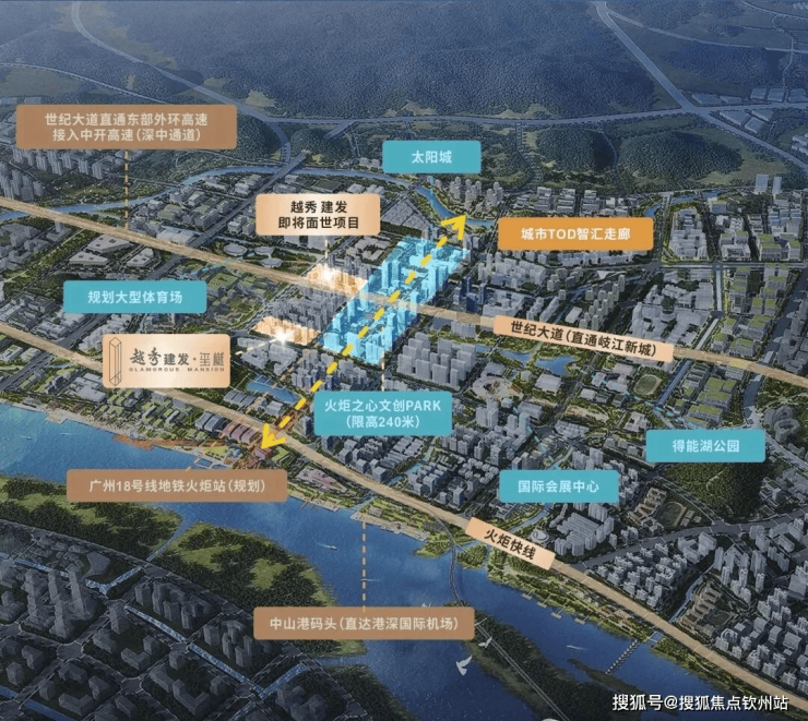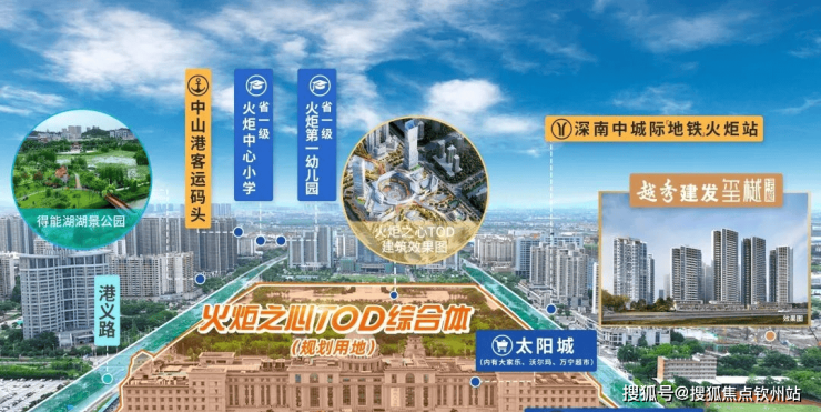 板块定位"城市TOD智汇走廊",规划240米地标群、19万㎡综合体"火炬之心文创PARK",未来将成中山城市新封面。