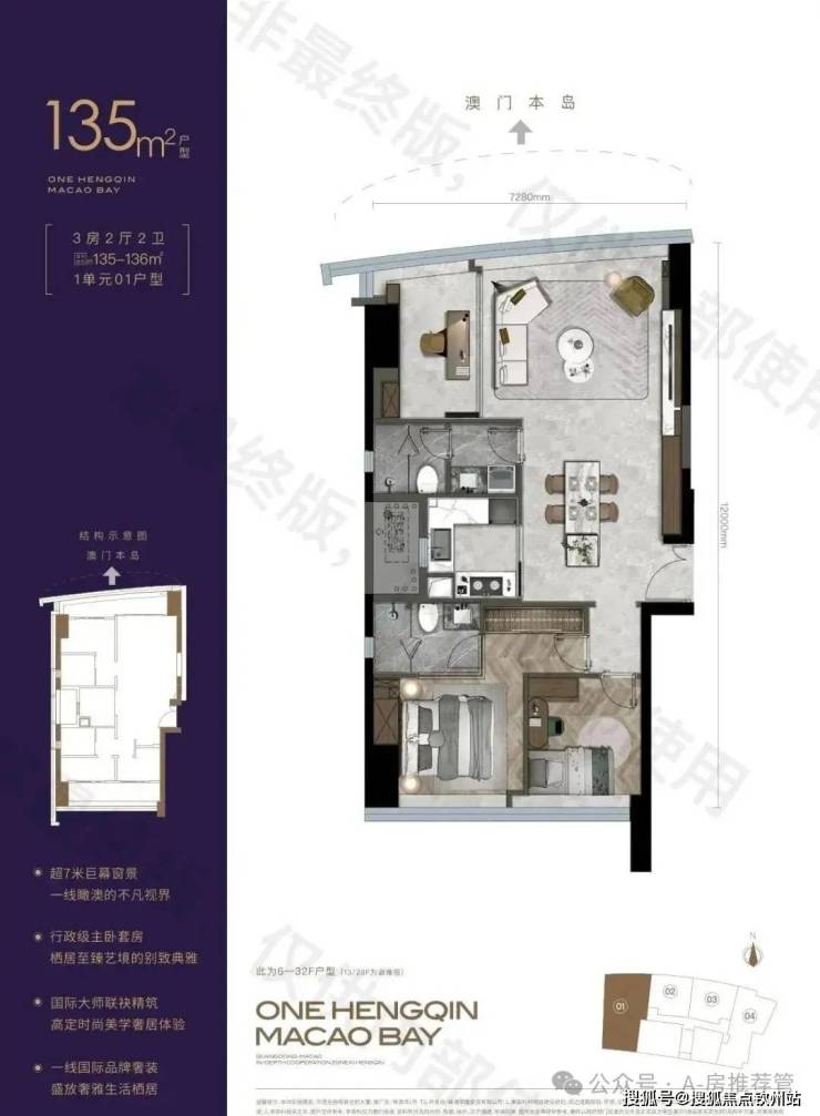 项目住宅产品定位“高端酒店式住宅“,满足高端商务型,旅居型豪宅客户群体,对标深圳湾 1 号、纽约 ONE57 公寓等世界级重磅住宅产品,产品面积从 78-135 ㎡,交付标准为奢配精装,选用国际一线品牌,如大金、博世、嘉格纳、美诺、当代、铂浪高、汉斯格雅等,革新横琴高端人居标准。