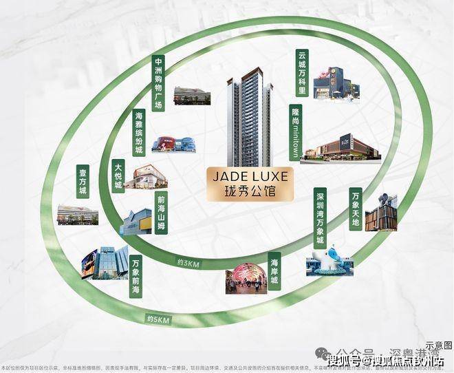 约3-5KM范围内:聚集南山前海山姆、云城万科里、万象前海、万象天地、海岸城、深圳湾万象城等高端及旗舰商业;以及宝中海雅缤纷城、大悦城、中洲购物广场等潮流商业MALL;