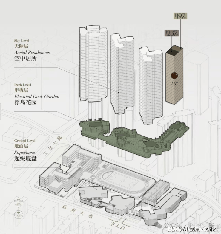 项目最动人的,是那片“浮”起来的生活场域。“浮岛甲板”不是炫技的建筑形态,而是对高密度城市居住痛点的温柔回应——把整个社区抬高12米,像托起一片悬浮的绿洲,底下藏着个“超级底盘”。