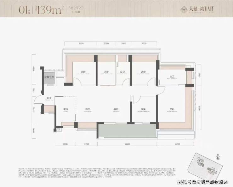 最后是01的139平5房2卫户型,可以看成是放大版的04,也在边户,比较通透的横厅设计,朝南看海,主卧尺度比较大,洗手间带双台盆和浴缸以及步入式衣帽间: