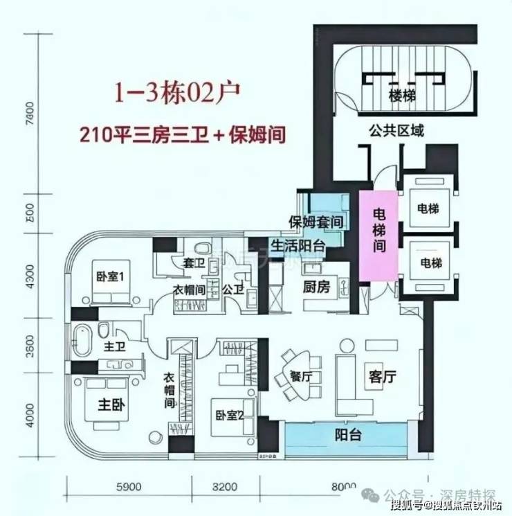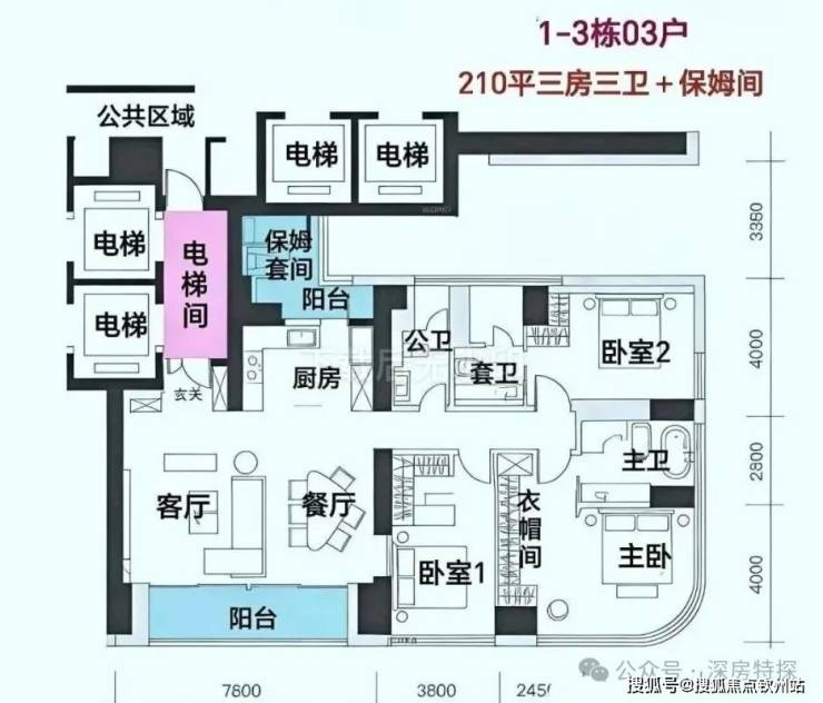 每户都是专梯入户+入户空间。C栋位于小区最里面,东南向户型(218㎡01)会被A、B栋遮挡。