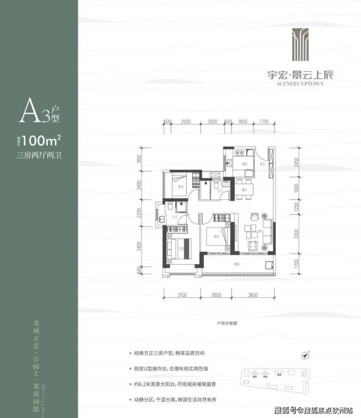 100㎡的3房2厅2卫,设计的是竖厅格局,客厅3.6米开间,LDKB一体化,三开间朝南,3个卧室分别做到了3.1米/2.6米/2.4米的宽度,客厅连接次卧出6.2米长的大阳台,U型厨房,卫生间干湿分离,得房率约76%(不含赠送),东南朝向。